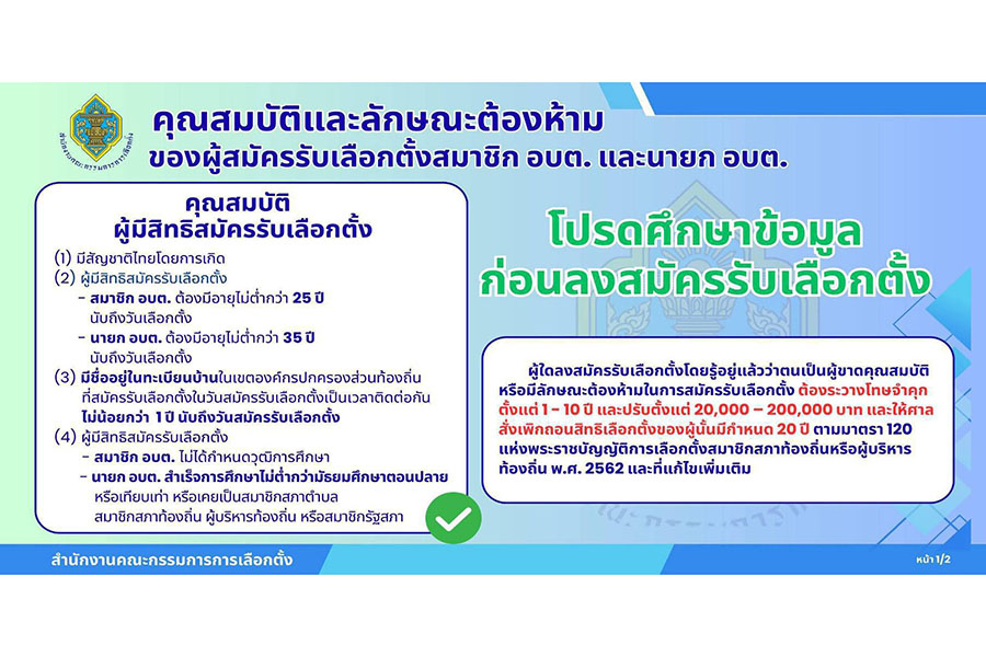 วันจันทร์, 27 ตุลาคม 2568 00:00องค์การบริหารส่วนตำบลนาคายประชาสัมพันธ์คุณสมบัติและลักษณะต้องห้ามของผู้สมัครรับเลือกตั้งสมาชิก อบต. และ นายก อบต.